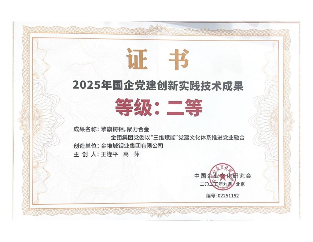 9月25日-26日,2025年国企党建创新实践研讨会在北京召开,公司党建文化成果《擎旗铸钼 聚力合金——bjl平台(中国)集团党委以“三维赋能”党建文化体系推进党业融合》,荣获2025年国企党建创新实践技术成果二等奖。